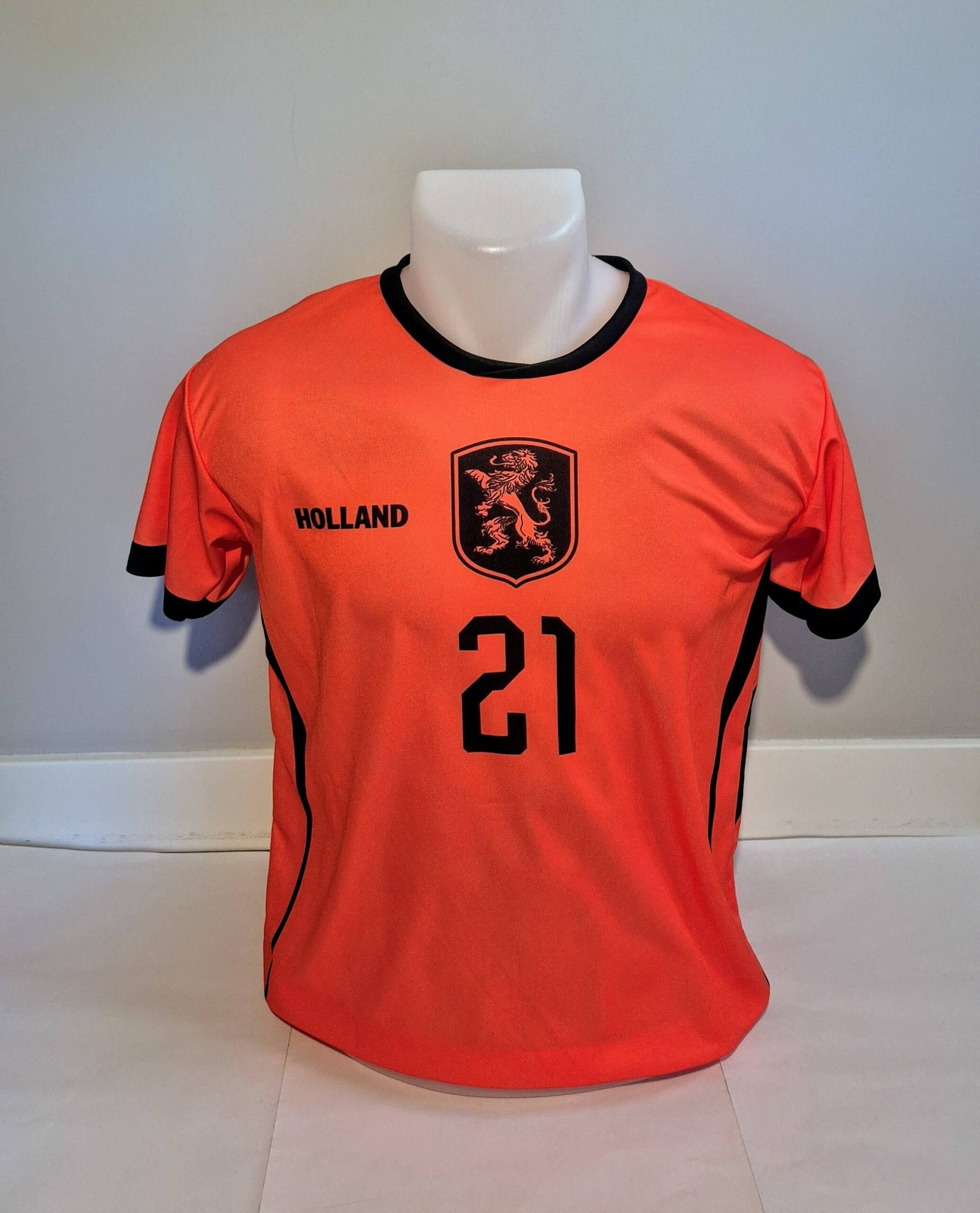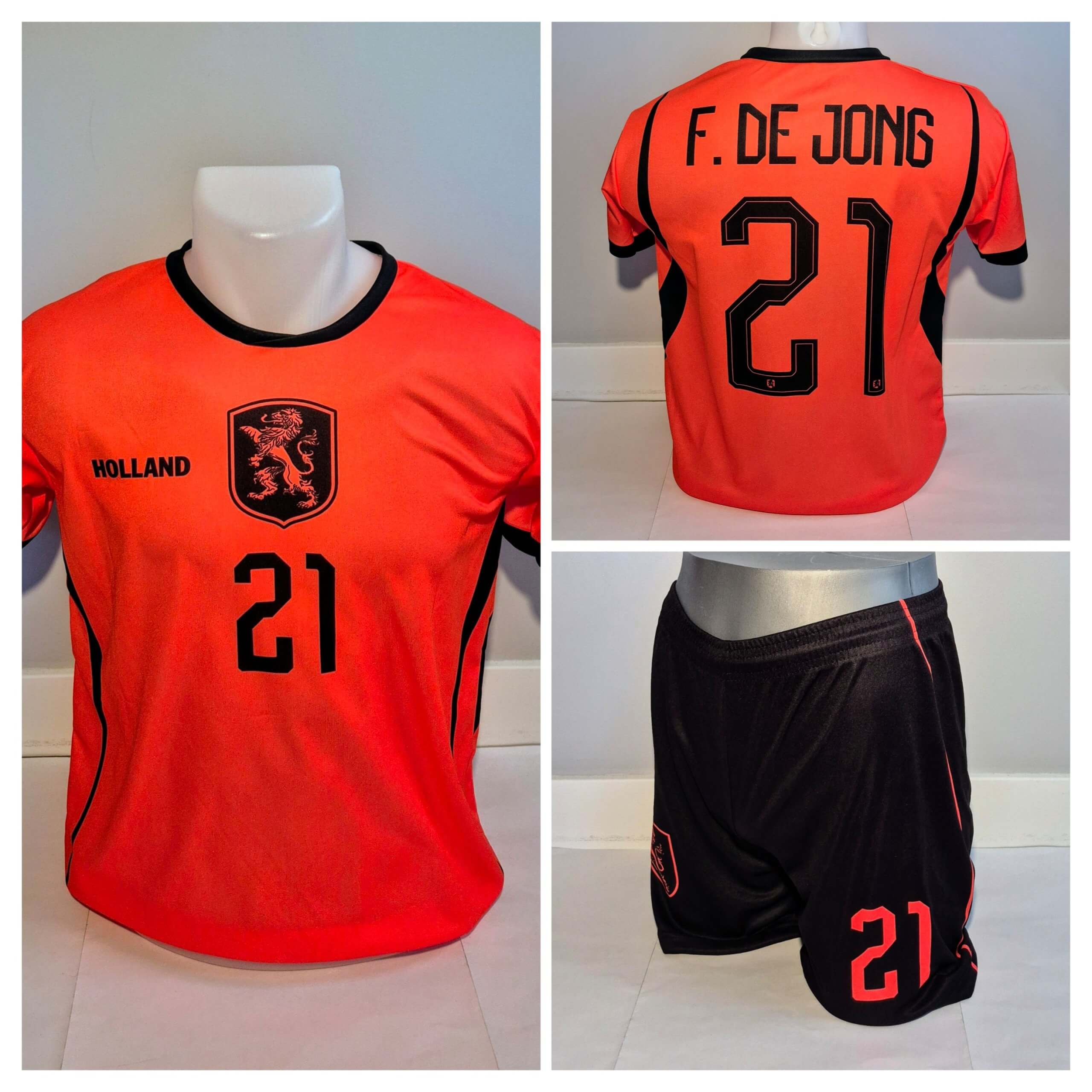 Het tenue van het Nederlands Elftal heeft op de achterkant de naam van de speler F.de Jong met rugnummer 21.